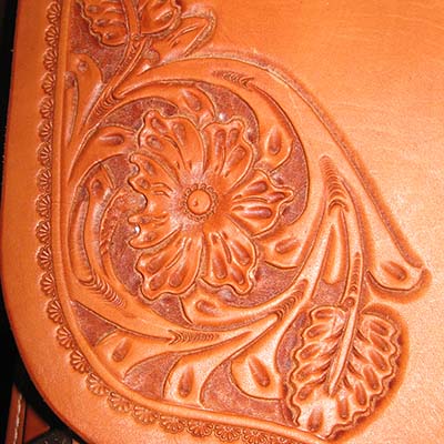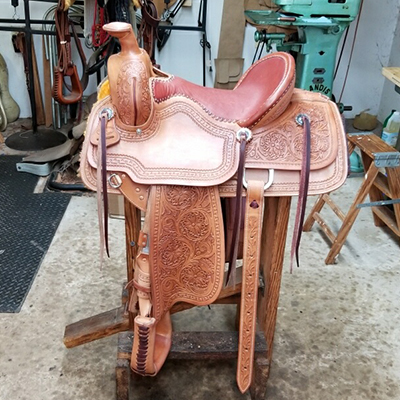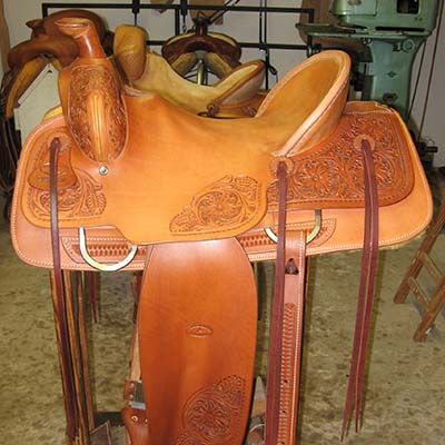 These cowboy saddles can be built on the tree of your choice. Generally still built using rawhide-covered wood trees, on the work saddles we usually have the tree glassed then covered with rawhide. This makes them stronger than a double covered tree but not quite as heavy in weight. Tress still have a little movement to flex with the horse, and saddles are available with full double riggings or flat plate rigs